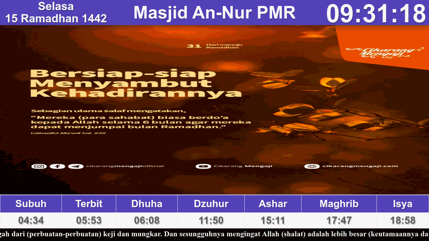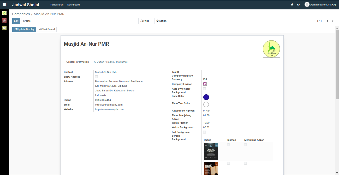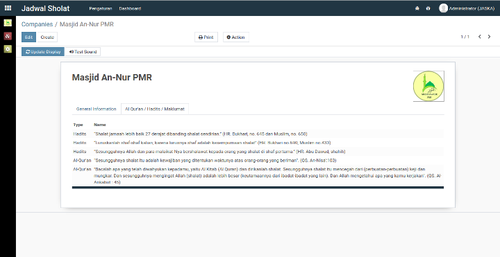 Pada beberapa waktu yang lalu, saya mencoba membuat aplikasi display jadwal sholat masjid menggunakan Odoo 14, walaupun belum sempurna dan masih sederhana tapi Alhamdulillah aplikasi ini sudah bisa digunakan dan sudah diimplementasikan di masjid tempat saya tinggal.