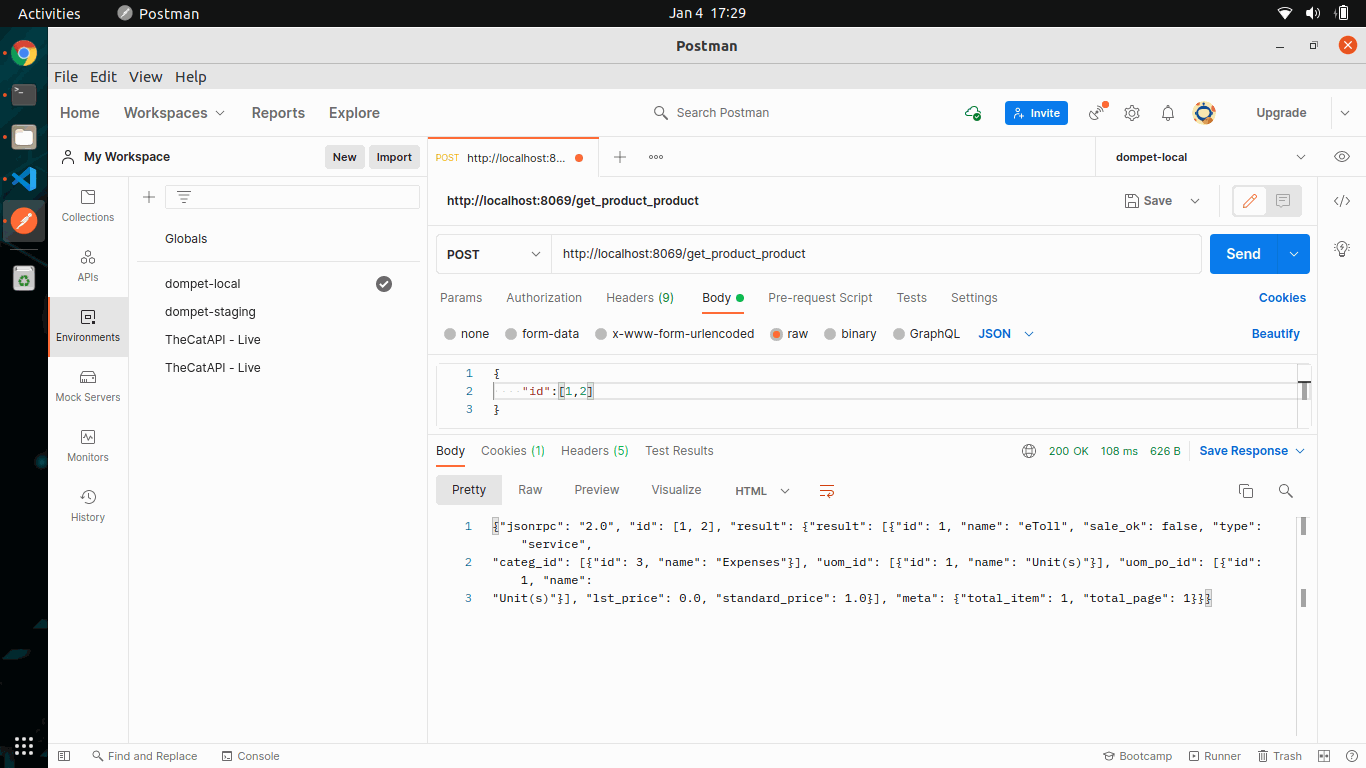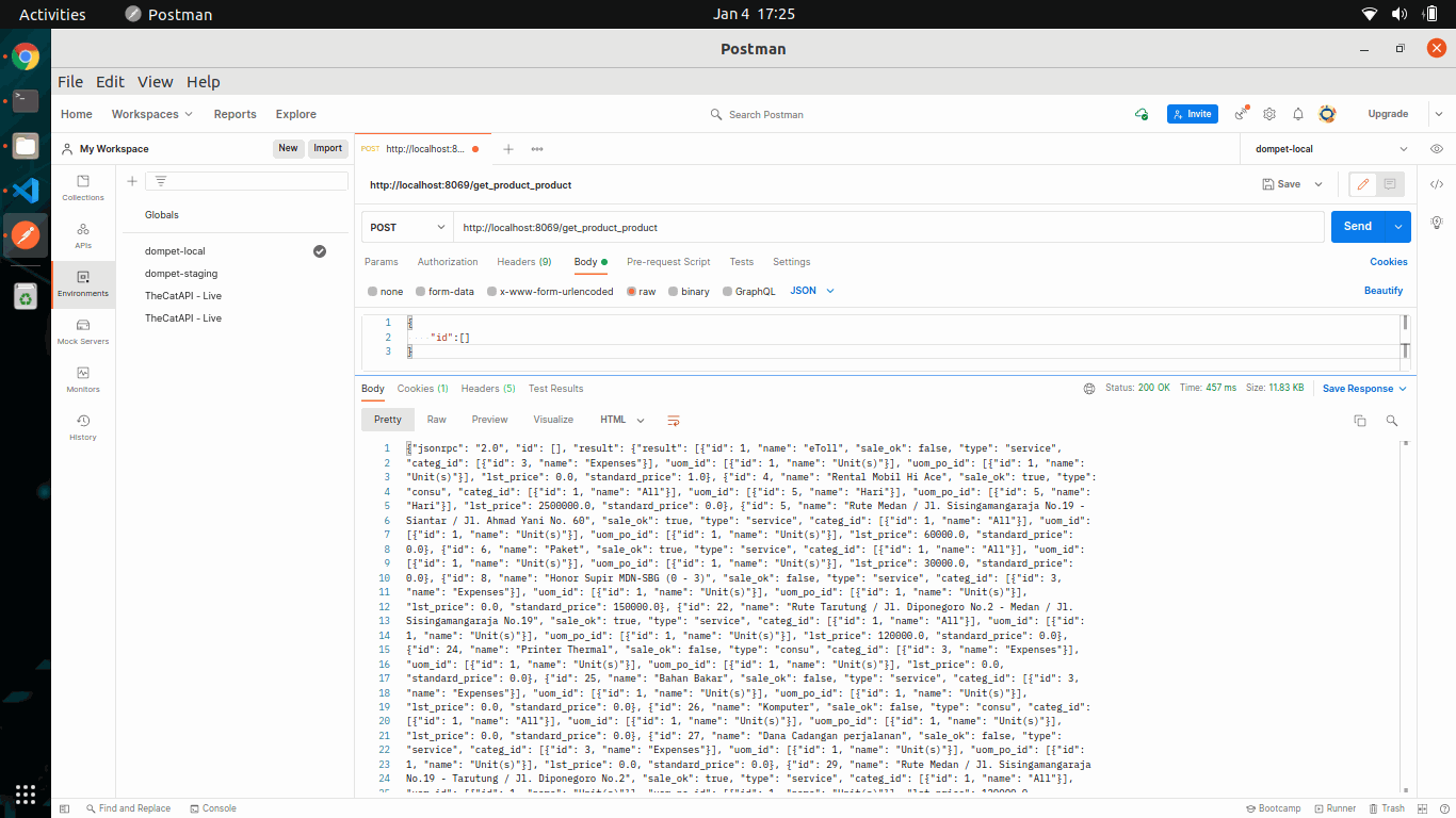 Untuk Selanjut kita loop data dengan memberika kondisi jika ada fields Many2one, maka kita akan menampilkan nilai dari id dan name. Dan silahkan uji coba dengan menggunakan postman sebelumnya kita install. Dan maka hasilnya: