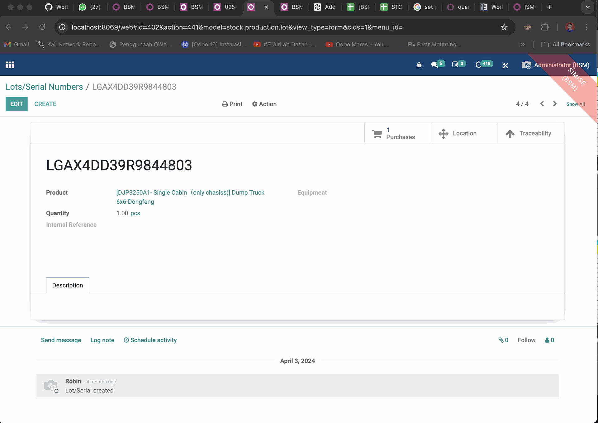 Pada contoh di bawah ini, product tersebut memiliki 4 Lot/Serial Number. Akan tetapi hanya 2 Product saja yang memiliki Quantity.