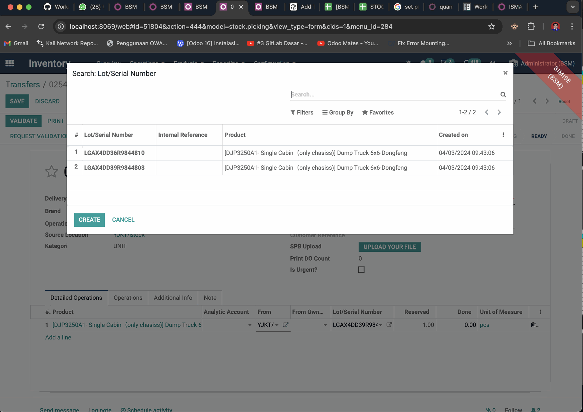 Disini saya mengcustom pada field Lot/Serial Number, agar memfilter dan menampilkan Lot/Serial Number yang memiliki Quantity saja.