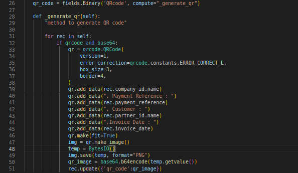 Pertama, saya membuat dahulu sebuah field dengan tipe data Binary di dalam sebuah model. Pada contoh ini, saya menamakan field tersebut dengan nama 'qr_code' dengan string 'QRcode'. Kemudian tambahkan sebuah atribut compute bersama dengan nama method compute yang bersangkutan. Pada contoh ini, saya menamakan method tersebut dengan nama '_generate_qr'. Setelah itu, buatlah sebuah method baru dengan nama yang sudah kita tentukan sebelumnya, lalu isilah method tersebut dengan baris kode berikut: