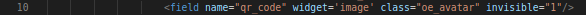 Kedua, kita akan membuat tag xpath yang akan kita isi dengan sebuah tag field yang akan menampilkan field 'qr_code' tadi, bersama dengan atribut "widget='image'" dan "class='oe_avatar'" seperti berikut: