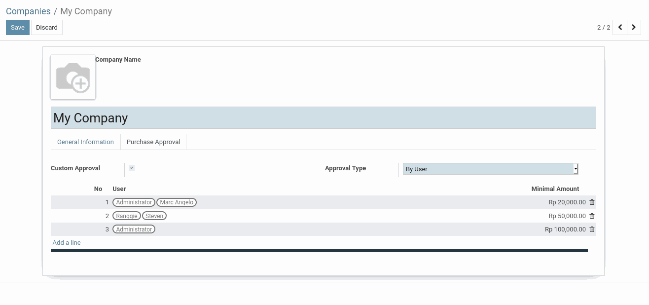 Untuk konfigurasi-nya terletak di Companies. Seperti gambar di bawah, kita dapat mengaktifkan fitur ini dengan cara mencentang “Custom Approval” di menu “Purchase Approval”.