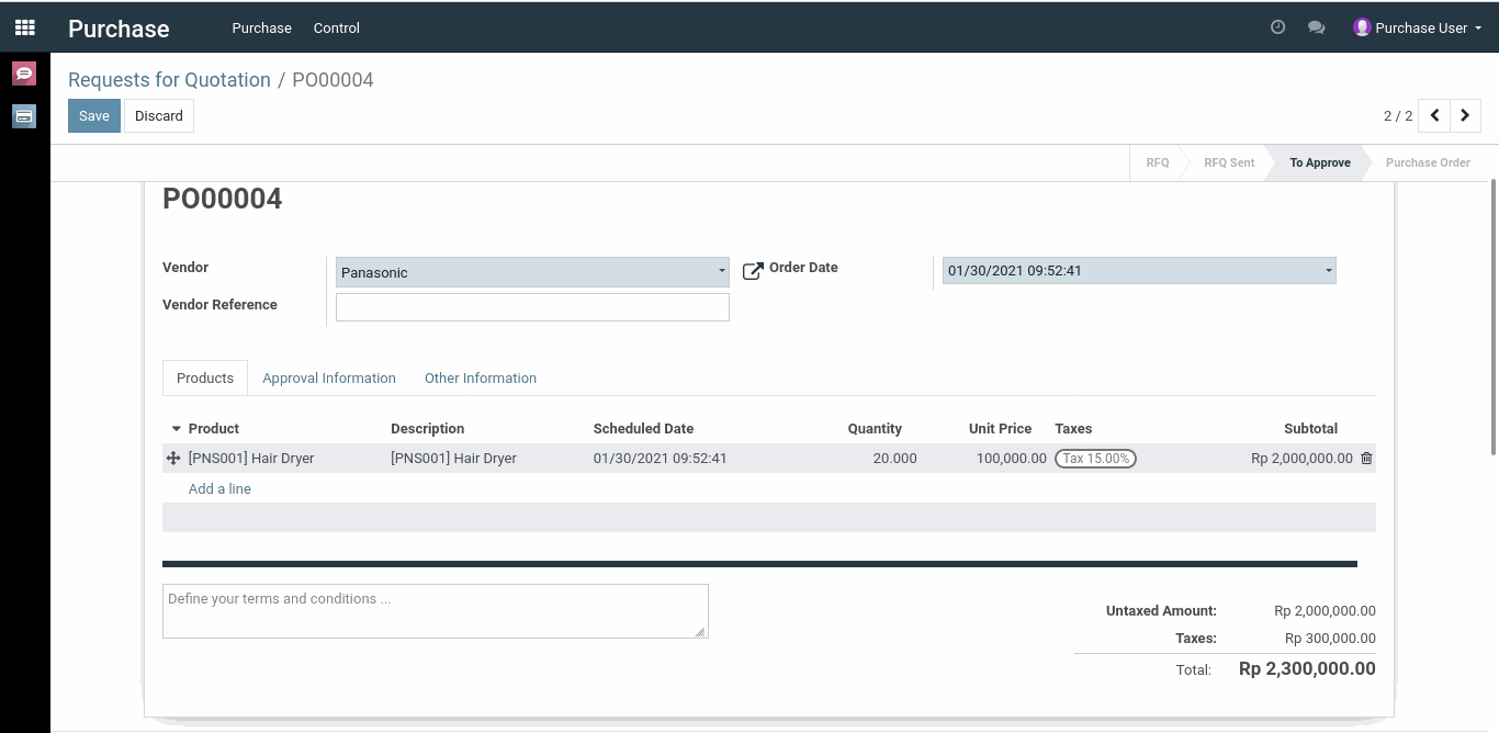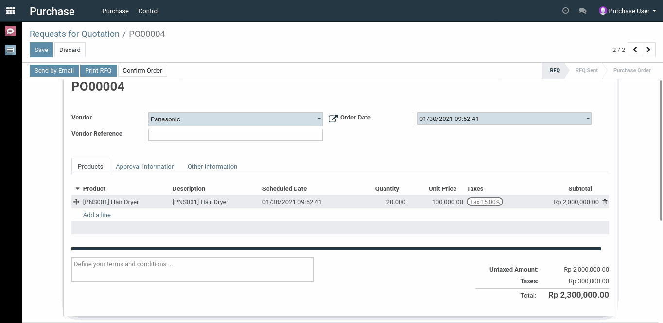 Di dalam kasus ini, saya telah membuat studi kasus dimana seorang user dengan nama “Purchase User” akan membuat dokumen Purchase Order seperti di bawah ini:
