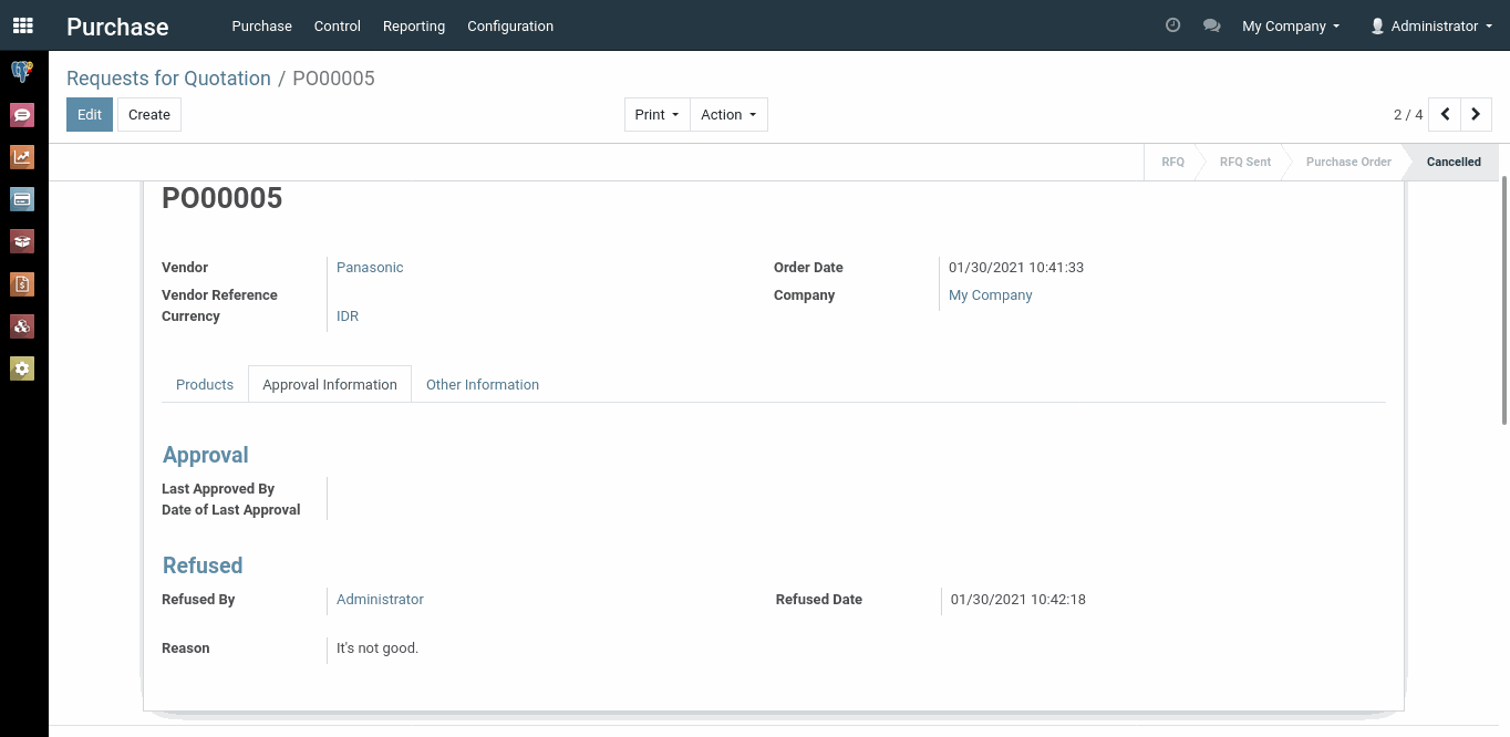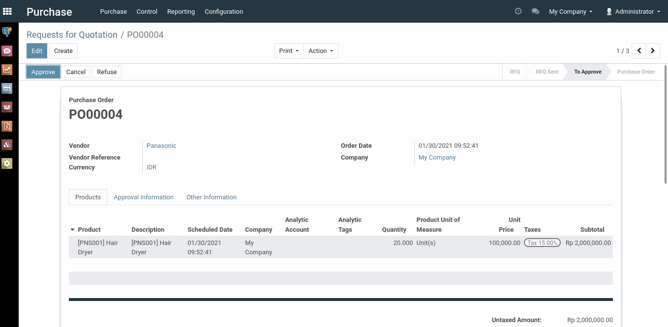 Dalam kasus ini, seorang user membuat dokumen dengan total jumlah pembelian sebesar Rp. 2.300.000. Jika kita melihat kembali gambar yang pertama, urutan pertama adalah Administrator dan Marc Angelo dengan minimal amount Rp. 20.000. Karena total jumlah pembelian melebihi dari minimal amount urutan yang pertama, maka dokumen ini harus disetujui dahulu oleh Administrator atau Marc Angelo selaku urutan yang pertama.
