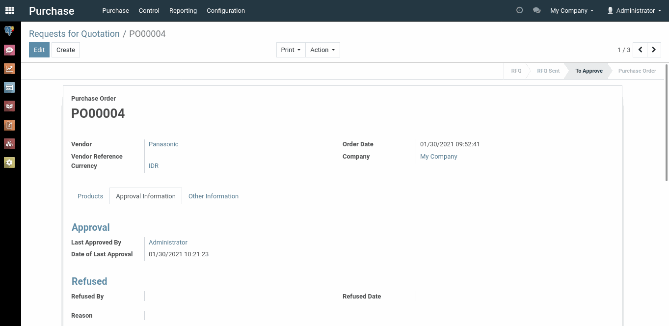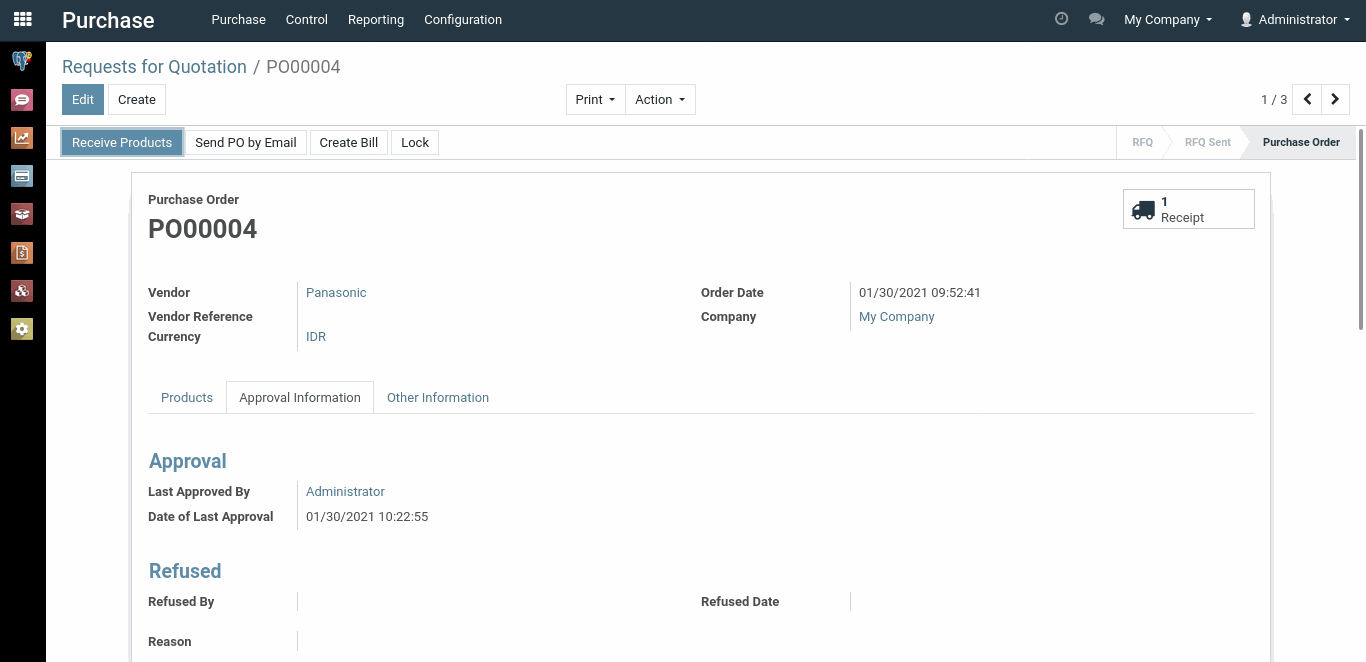 Lalu pada urutan terakhir adalah Administrator. Jika urutan terakhir melakukan persetujuan, maka dokumen Purchase Order otomatis membuat dokumen Transfer Incoming Receipt.