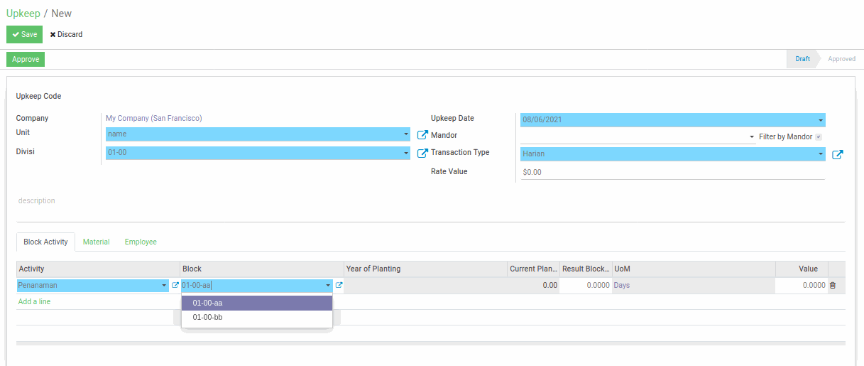 maka ketika kita menambahkan record baru pada one2many dan memilih block, block yang sudah dipilih yaitu 01-00-aa tidak akan muncul lagi