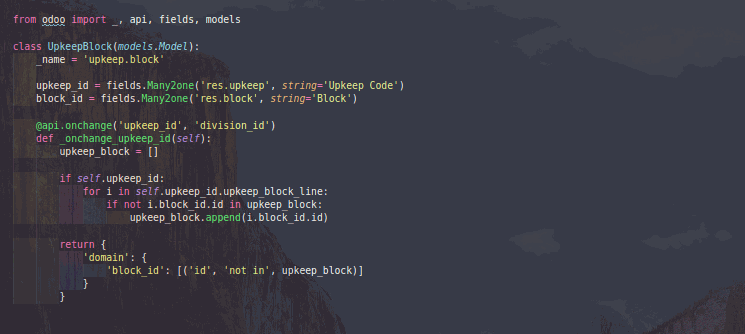 if self.upkeep_id: dan di dalam kondisi if tersebut kita buat perulangan one2many upkeep_block_line yang ada di header ke child, karena method kita berada di child maka kita harus menggunakan relasi ke header untuk melakukan perulangan dengan kode