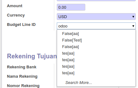 Masalah : Secara default odoo hanya menggunakan field 'name' pada saat many2one dicari di tempat lain. Dalam posting ini saya akan mencari field Budget Line ID dan menambahkan field many2one lain saat Budget Line ID dicari , contohnya seperti gambar berikut: