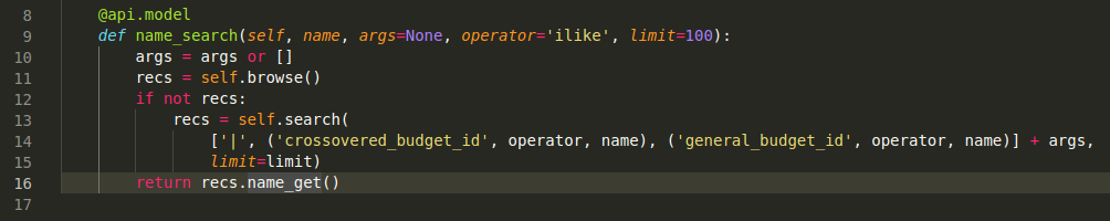 Penjelasan: Di sini kita mengganti metode 'name_search' bawaan dari Odoo. Dan pada baris no 14 mencari crossovered_budget_id atau general_budget_id dan bukan 'name'