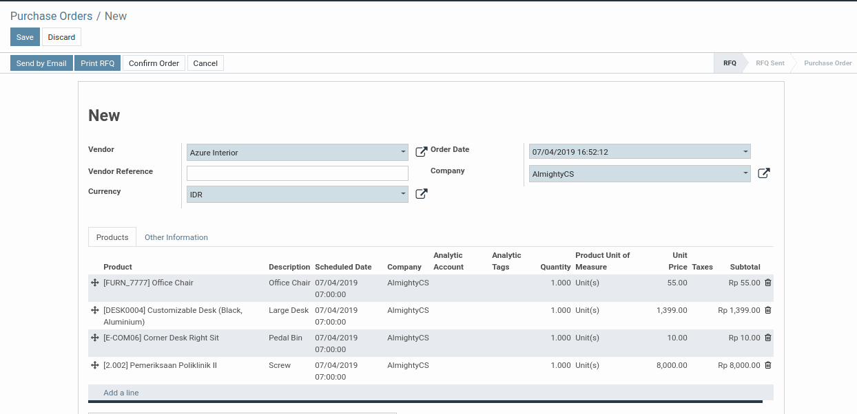Disini saya akan membuat purchase order line terisi secara otomatis (berdasarkan data vendors yang ada di masing - masing product) ketika dipilih vendor-nya pada saat create Purchase Order.