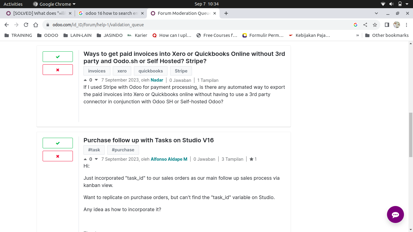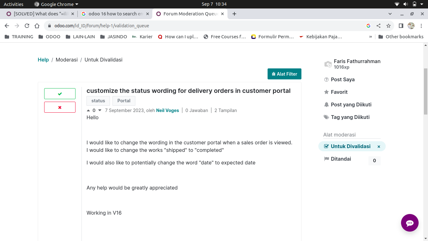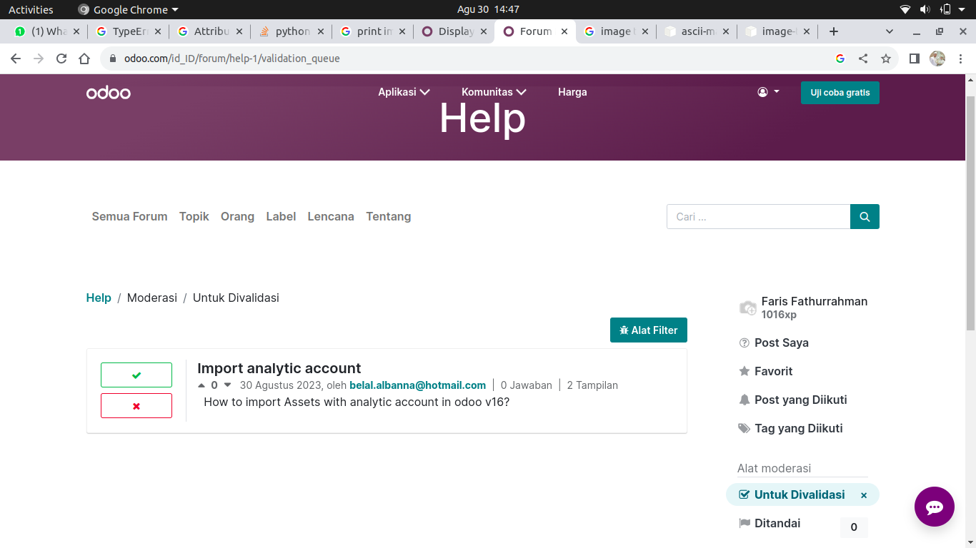 Pada artikel kali ini, izinkan saya membagikan sedikit pengalaman saya. Berikut adalah beberapa tangkapan layar yang menunjukkan beberapa tampilan yang saya dapatkan ketika saya, secara tanpa pengetahuan saya, dijadikan sebagai Moderator pada Forum resmi milik Odoo di Odoo.com: