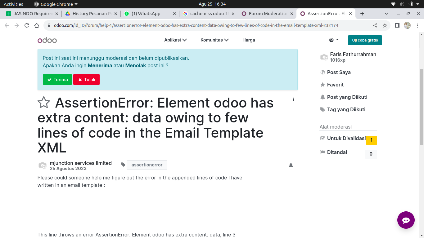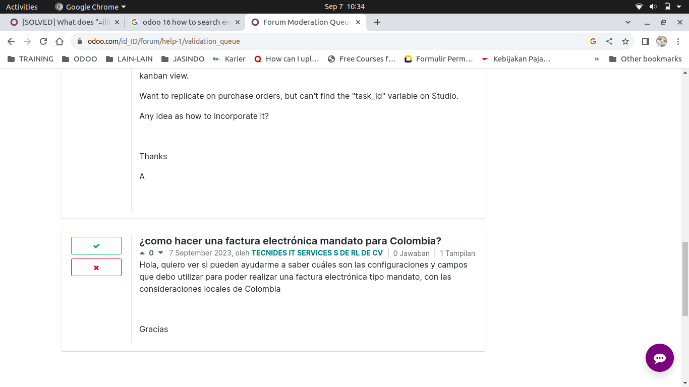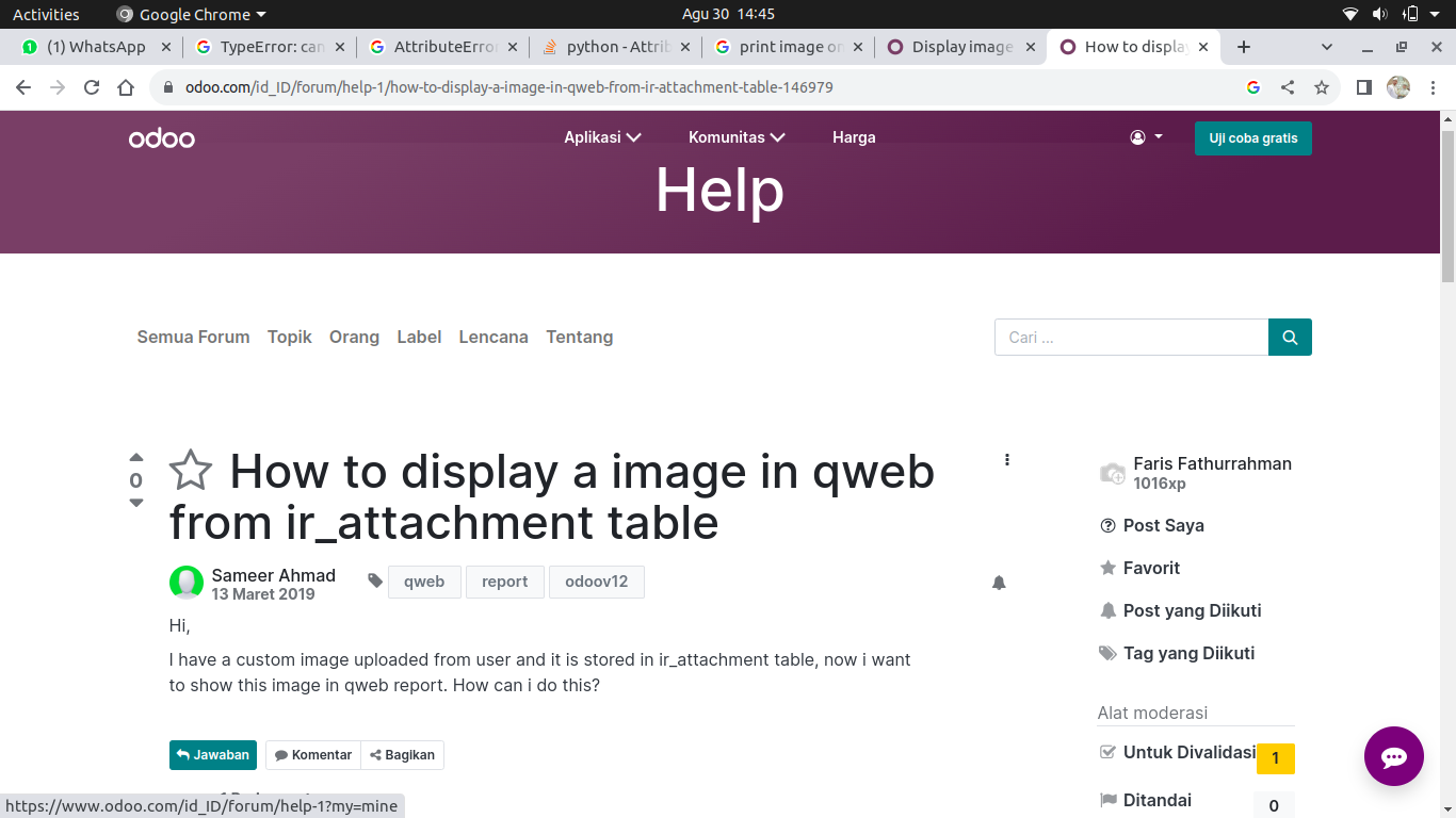 Pada artikel kali ini, izinkan saya membagikan sedikit pengalaman saya. Berikut adalah beberapa tangkapan layar yang menunjukkan beberapa tampilan yang saya dapatkan ketika saya, secara tanpa pengetahuan saya, dijadikan sebagai Moderator pada Forum resmi milik Odoo di Odoo.com: